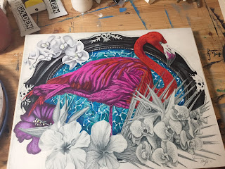 I'm part of this monthly art group, The Bird Whisperers, and (as I'm sure you can guess) we paint birds. It's a lot of fun, and a great way to see several interpretations of the same reference photo. It's always amazing to me to see so many different styles, and everyone in the group is so positive and fun. Our bird for March, was the Greater Flamingo, and while they are fun birds, I have a hard time with the color pink. Maybe it's some weird internal trauma from being a girl, and having that color practically shoveled down my throat every time I turned around. But I digress......